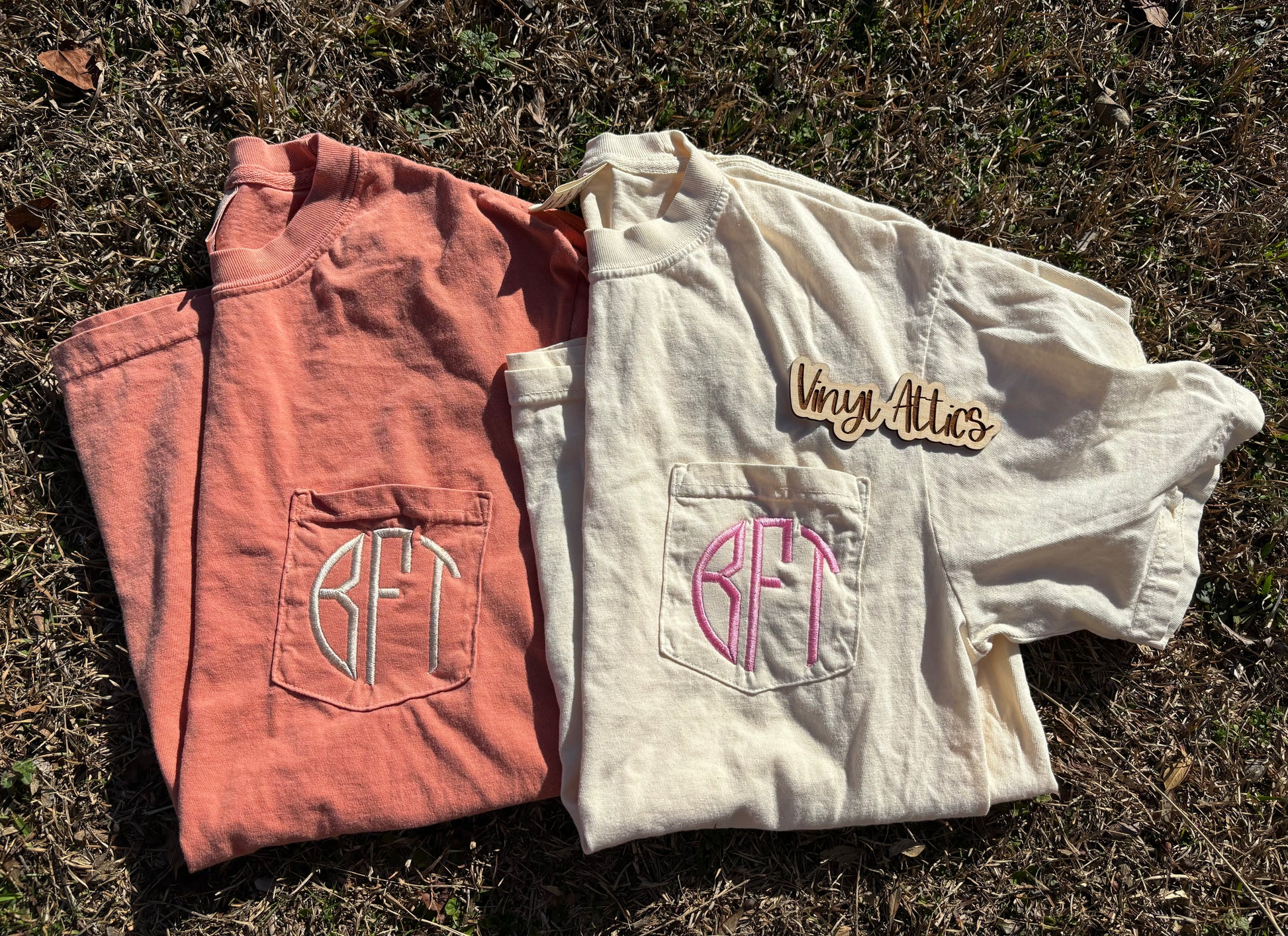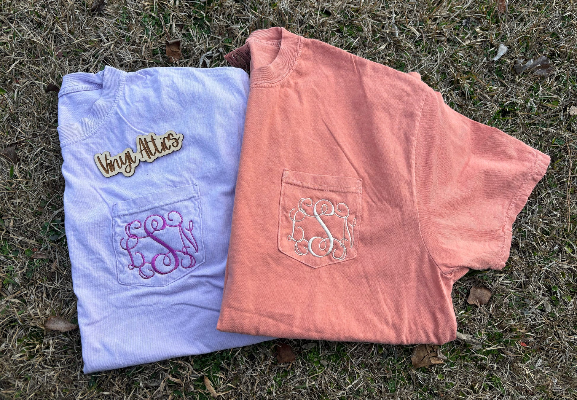 100% comfort color pocket tee sale!! Please see pictures above for thread colors and font options!