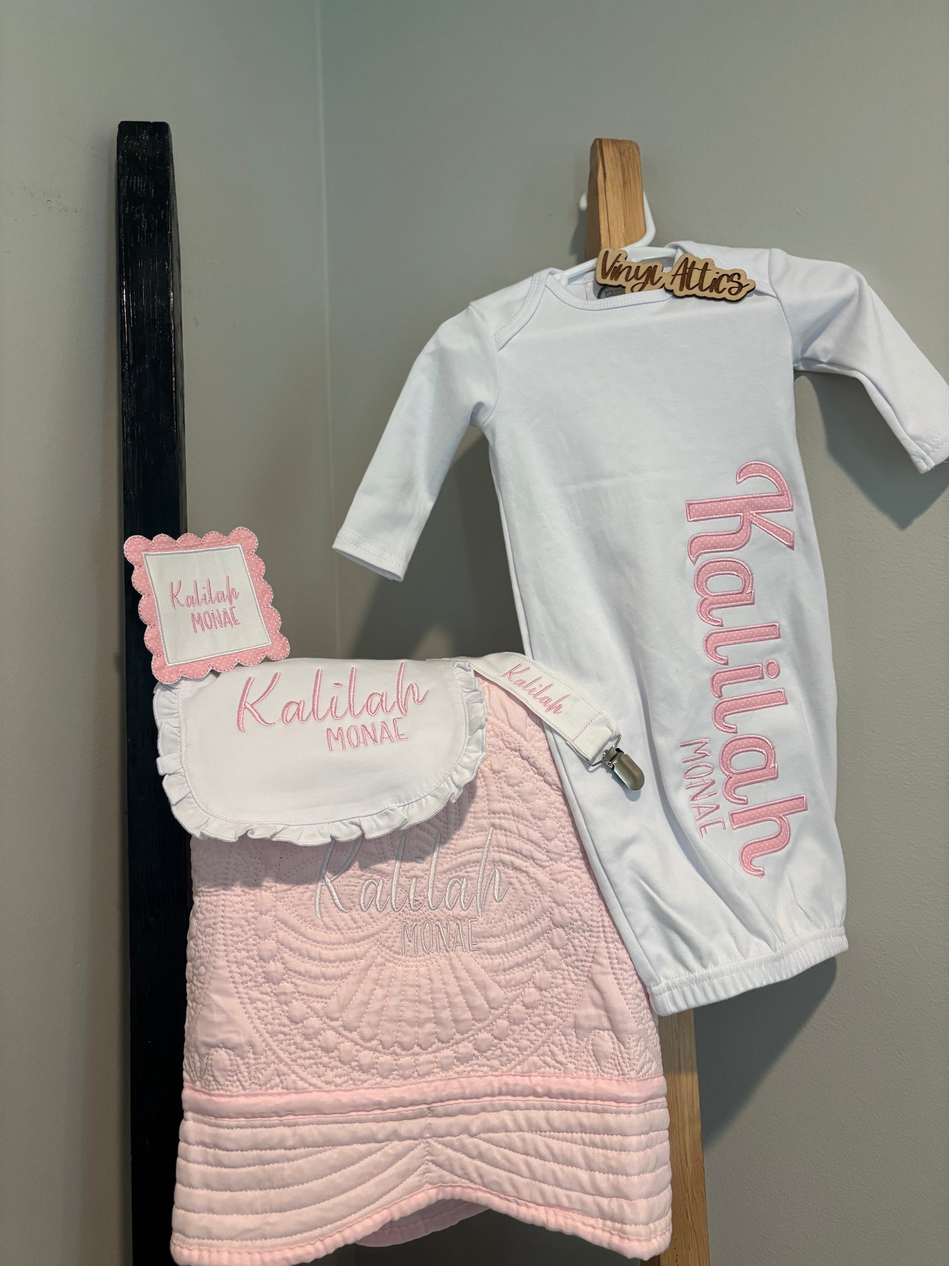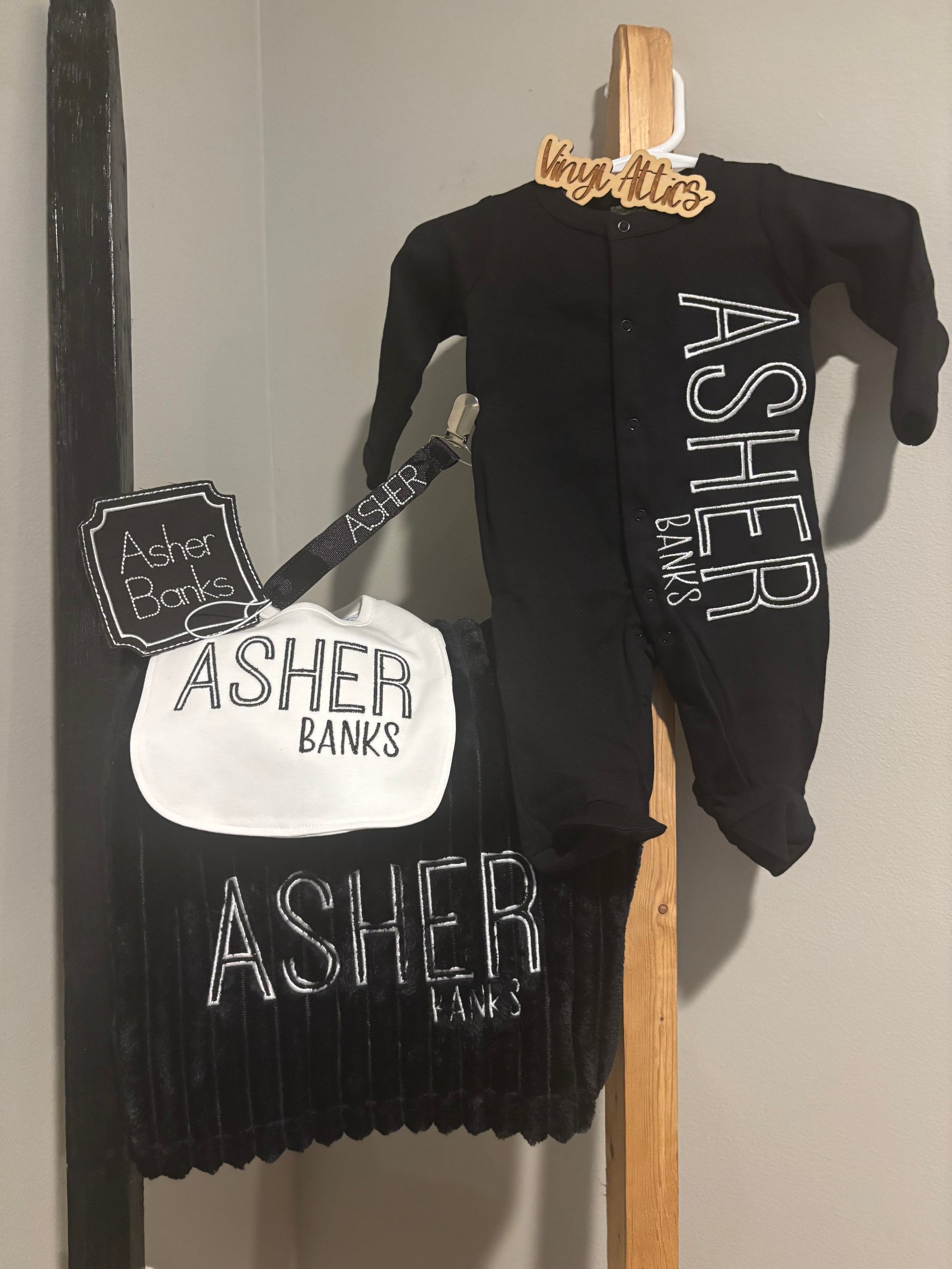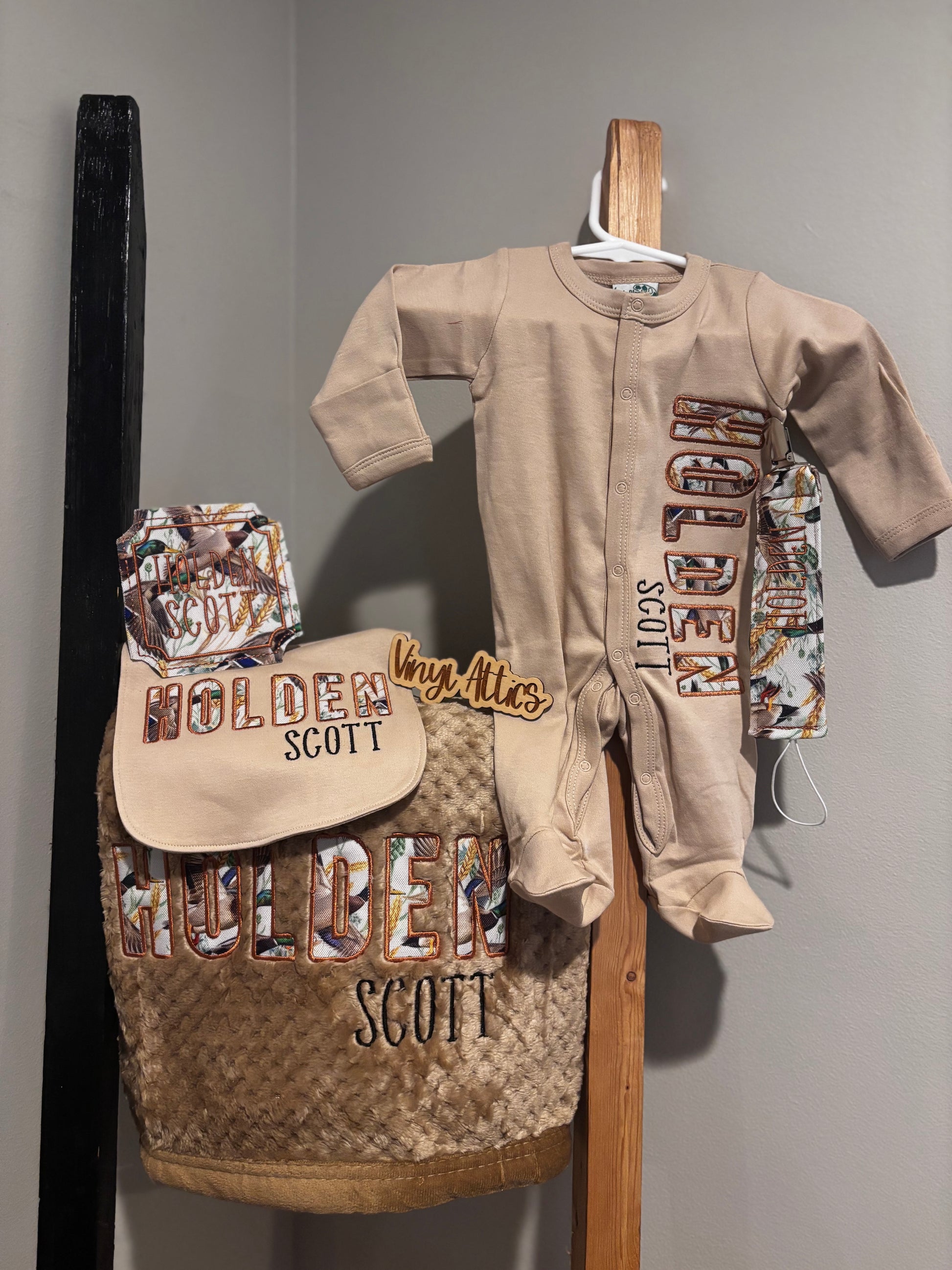 These are completely custom. If you want to order a custom instead of one posted please email or message me on Facebook. I have some styles I have done I’m unable to post until after baby is born! The difference in the styles- one has the heirloom style blanket and the other is a fluffy blanket. Everything is embroidered, please make sure to spell all names correctly, you’re responsible for reordering if you misspell and I have already made items.