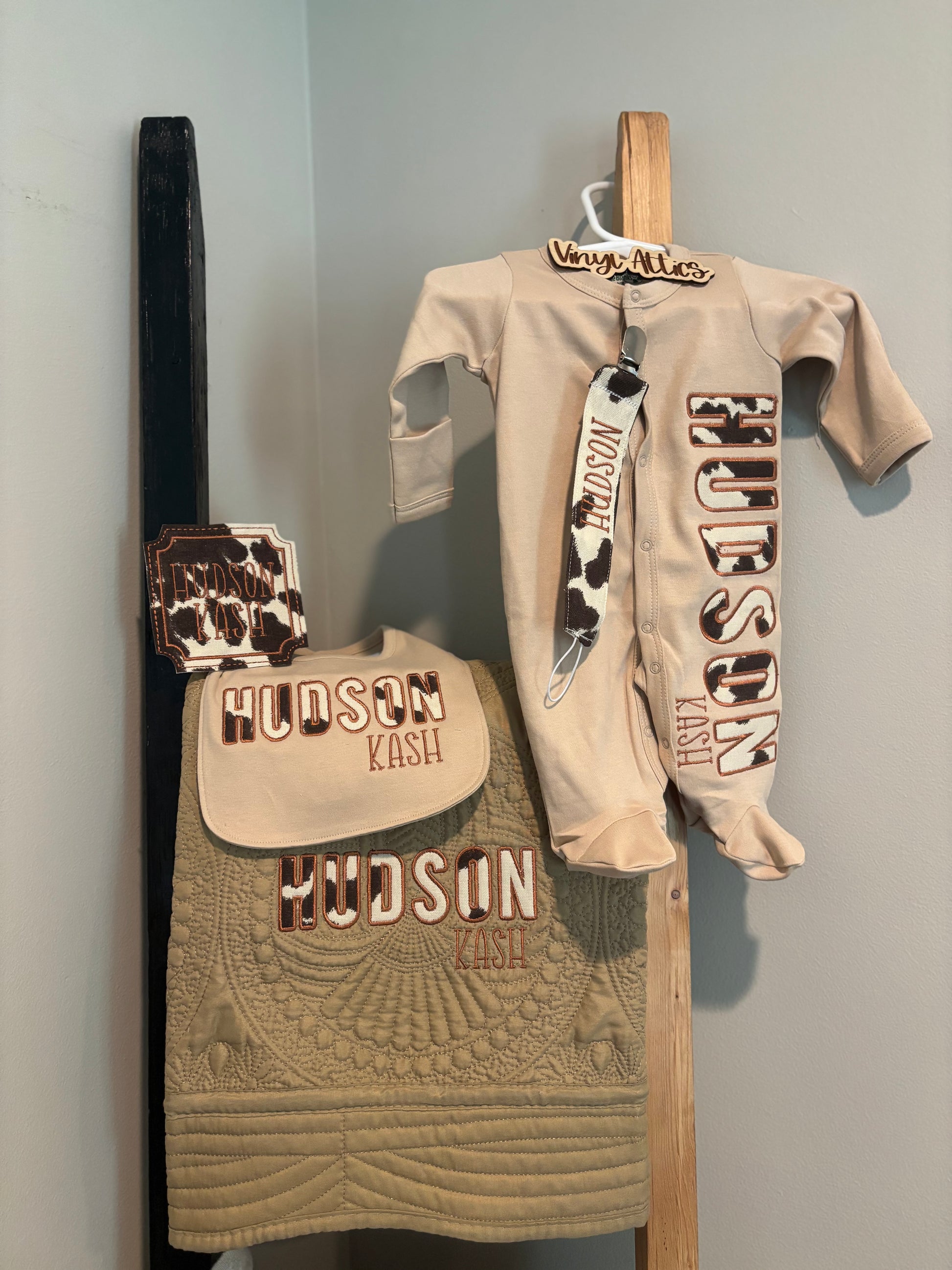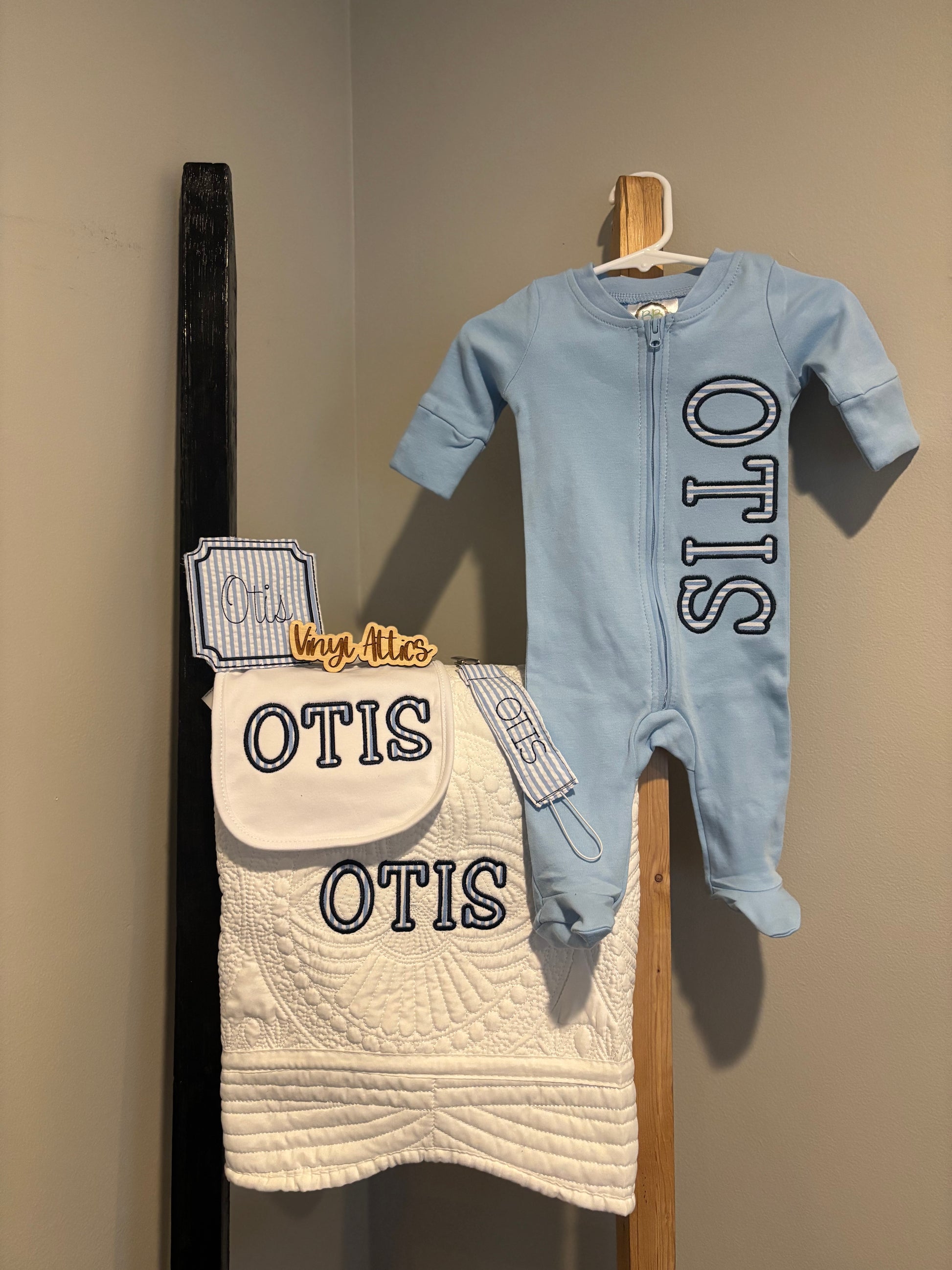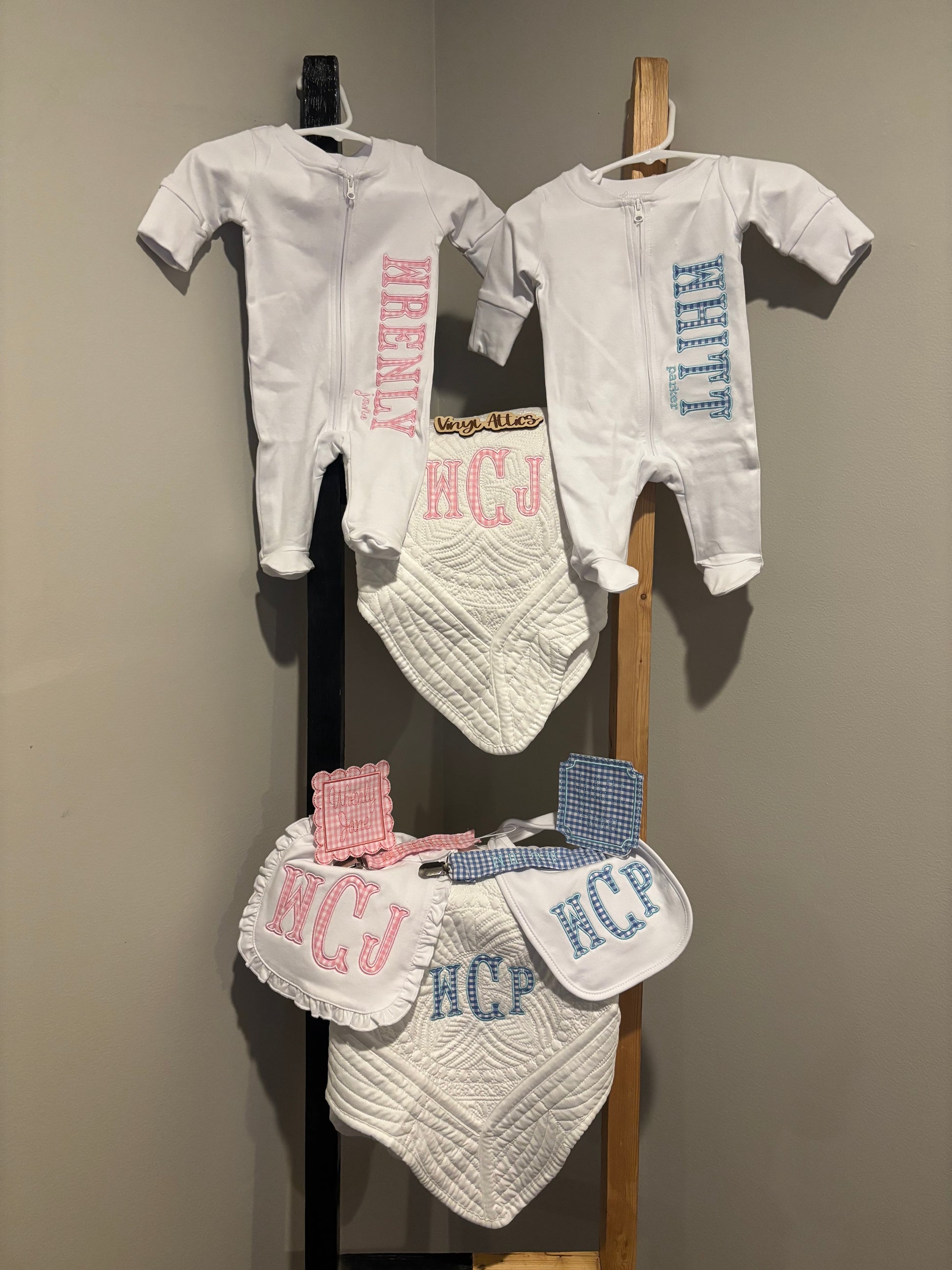 These are completely custom. If you want to order a custom instead of one posted please email or message me on Facebook. I have some styles I have done I’m unable to post until after baby is born! The difference in the styles- one has the heirloom style blanket and the other is a fluffy blanket. Everything is embroidered, please make sure to spell all names correctly, you’re responsible for reordering if you misspell and I have already made items.