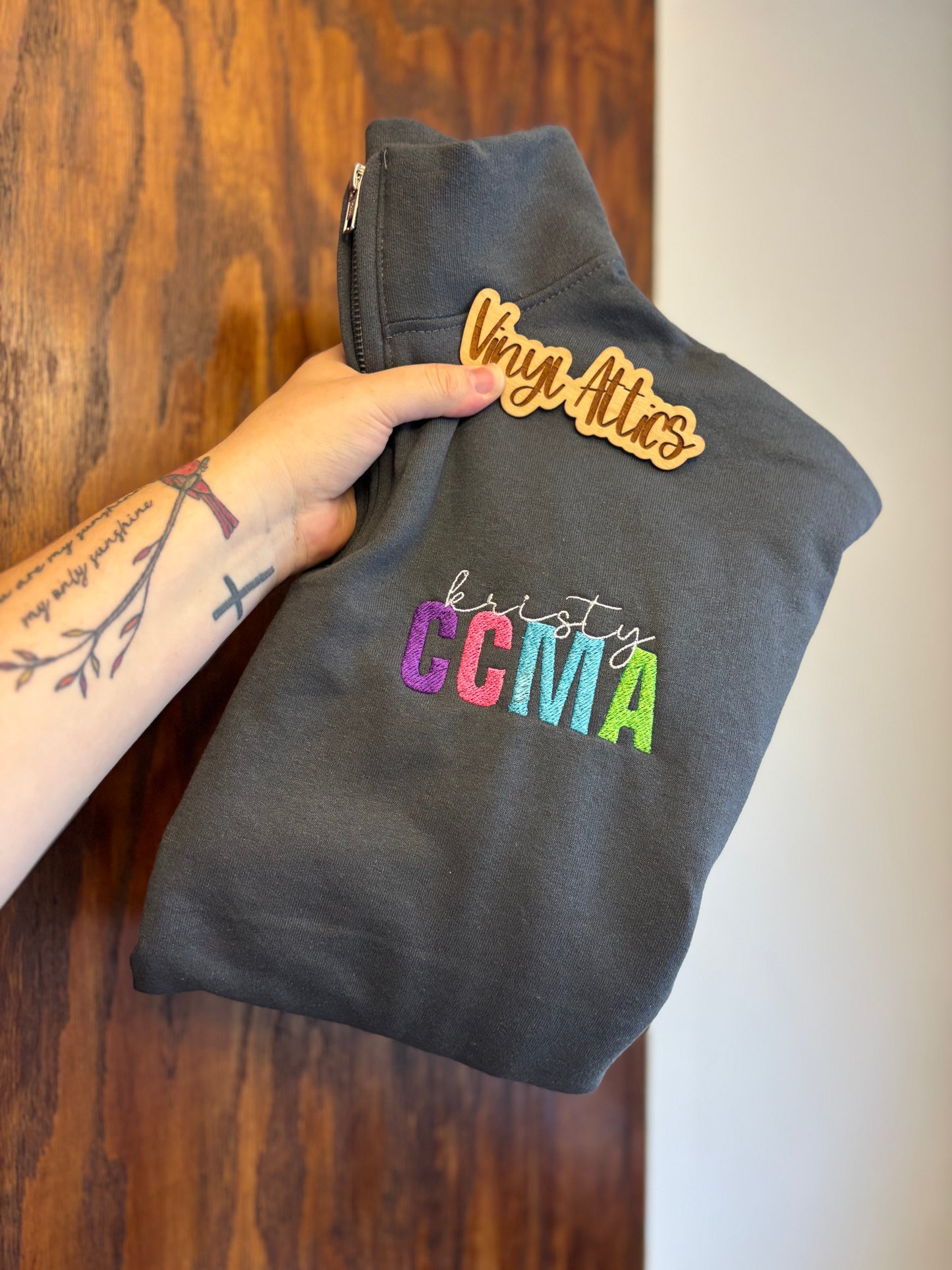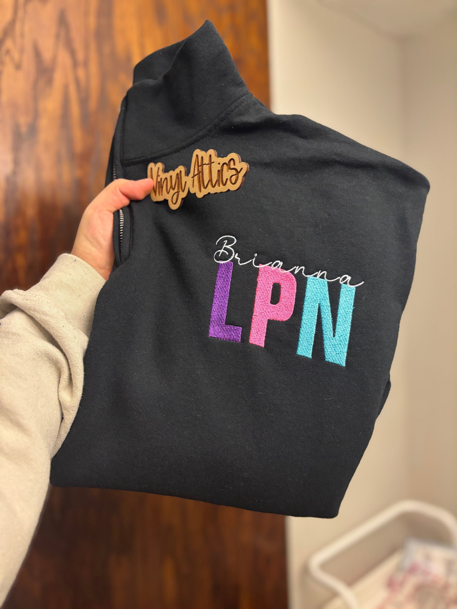 50/50 cotton/ polyester jerzee embroidered quarter zip sweatshirt! Custom to any! LPN, RN, etc!!!!